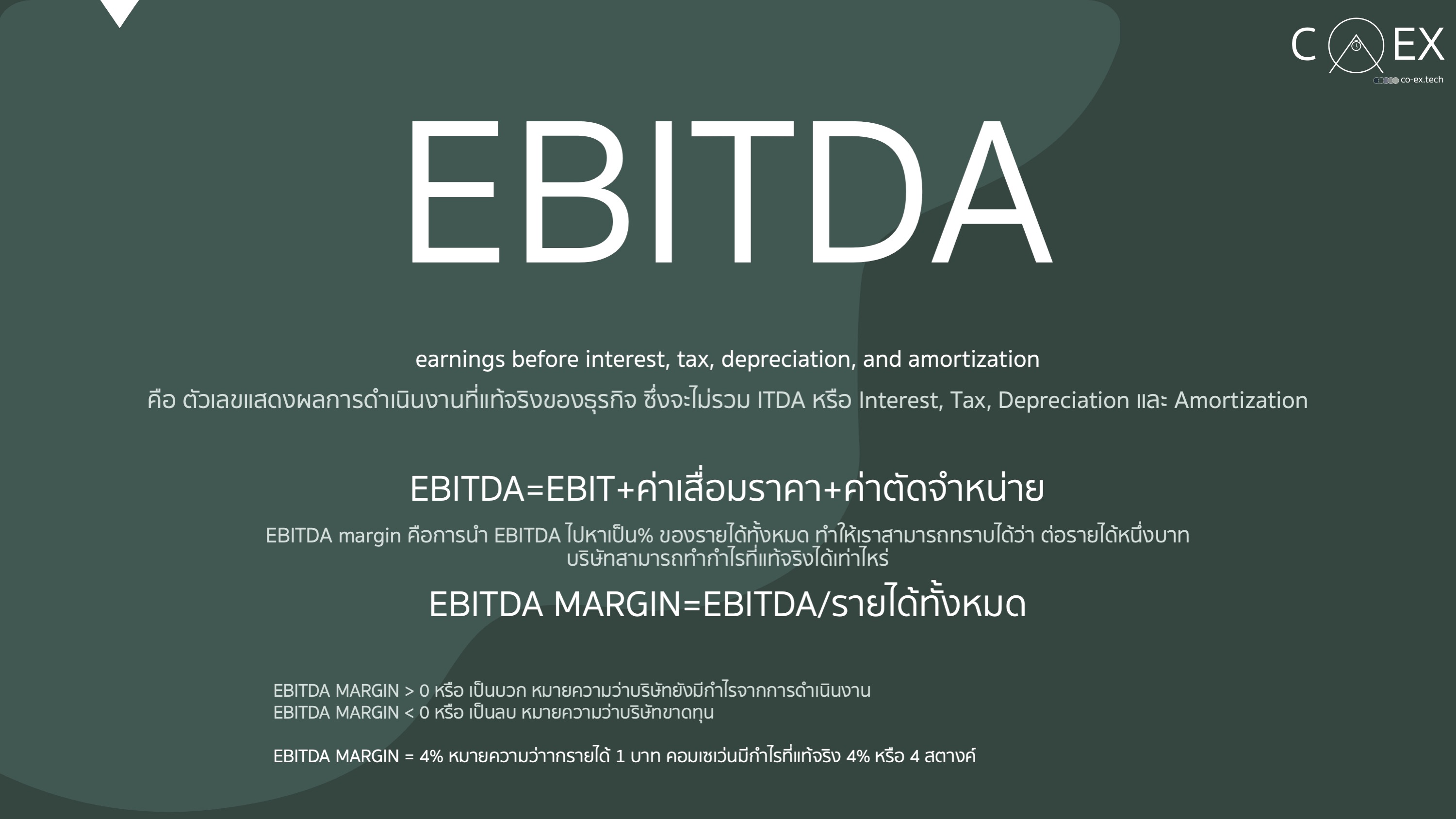 EBITDA (Earnings Before Interest, Tax, Depreciation และ Amortization) เป็นตัวเลขแสดงผลการดำเนินงานที่แท้จริงของธุรกิจ ซึ่งจะไม่รวม ITDA หรือ Interest, Tax, Depreciation และ Amortization อธิบายต่อได้ดังนี้